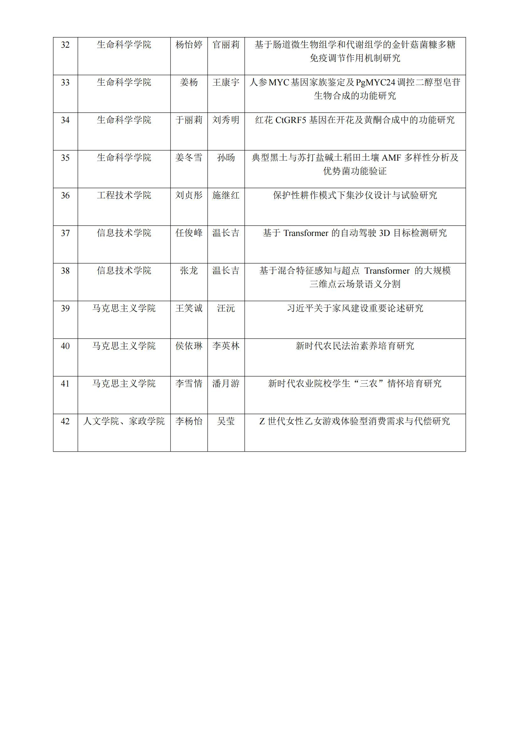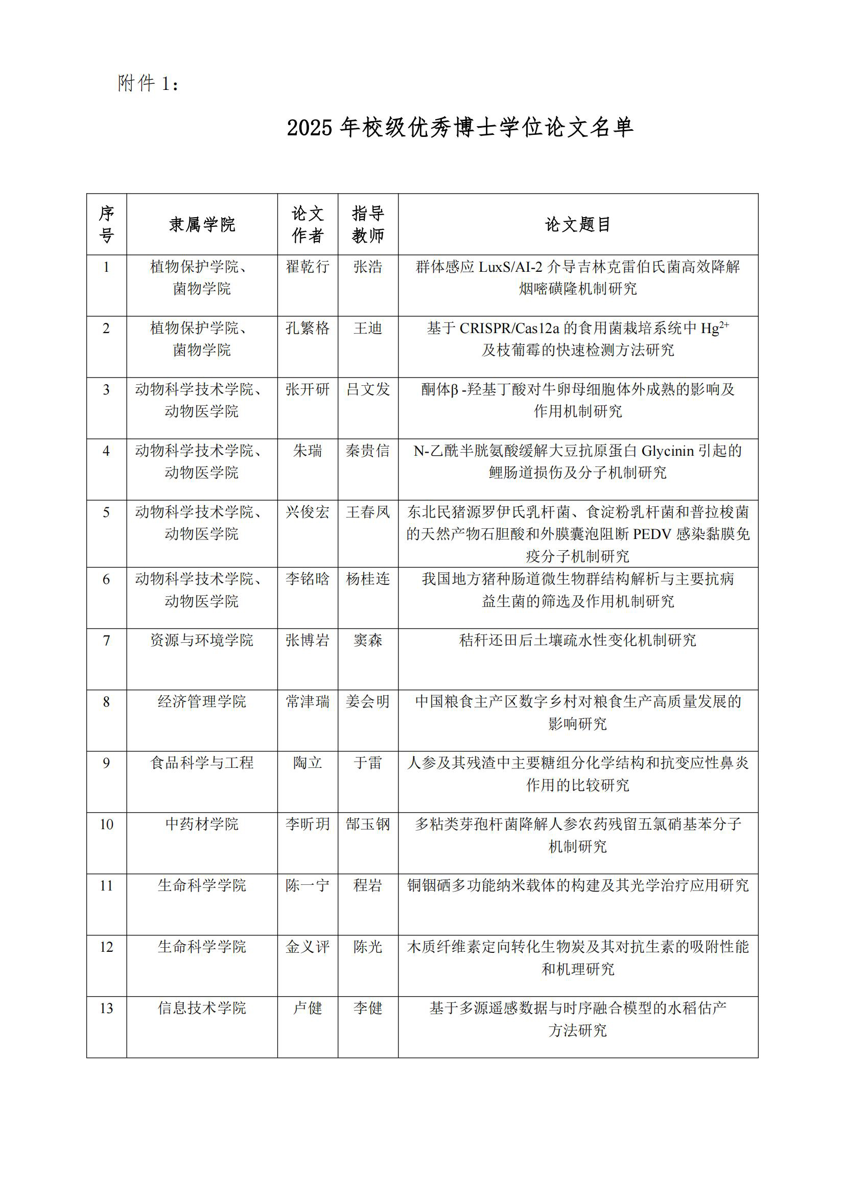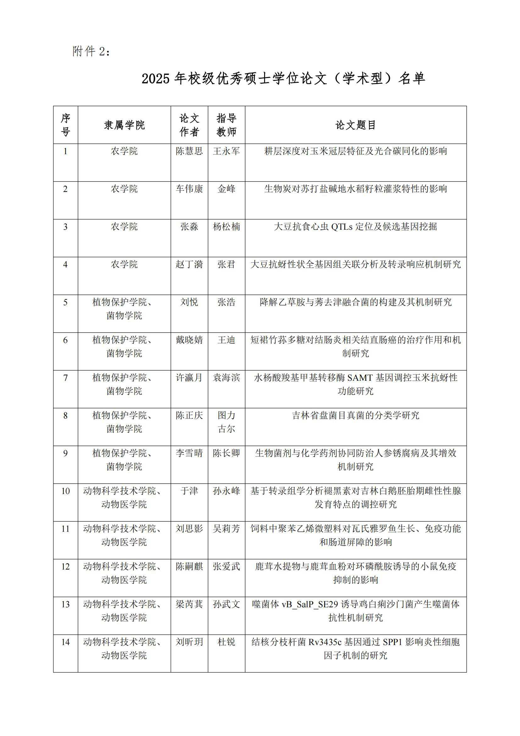 根据《吉林农业大学研究生优秀学位论文评选及奖励办法》(吉农大字〔2021〕241 号)文件精神,经本人申请、学科推荐、各学位评定分委员会初审、研究生院复审、校学位评定委员会审定等程序, 评选出王迪教授指导的博士生孔繁格撰写的《基于CRISPR/Cas12a的食用菌栽培系统中Hg2+及枝葡霉的快速检测方法研究》等13 篇论文为 2025年校级优秀博士学位论文;评选出王永军研究院指导的硕士生陈慧思撰写的《耕层深度对玉米冠层特征及光合碳同化的影响》等42 篇论文为 2025 年校级优秀硕士学位论文,现予以公示如下: