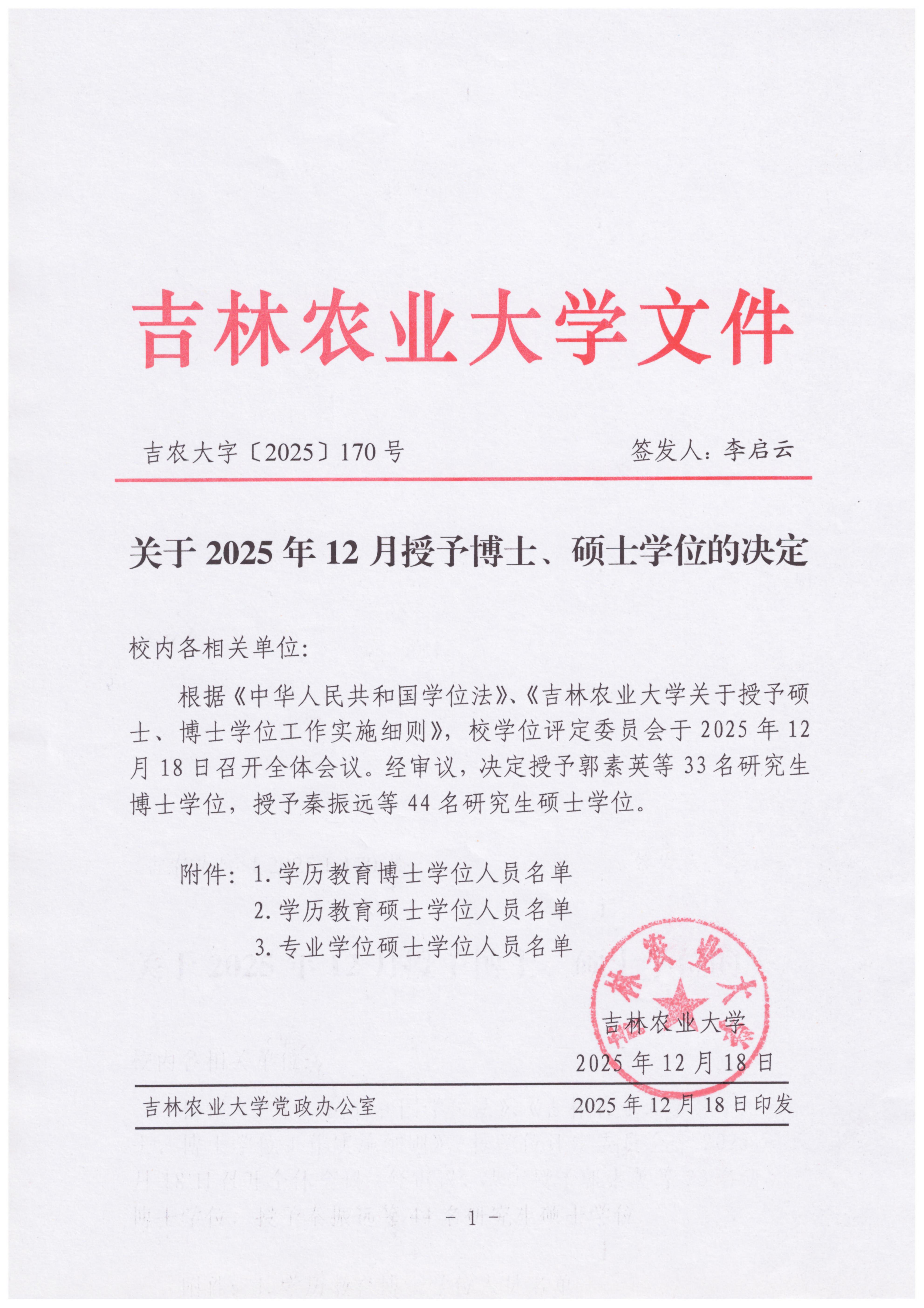 关于2025年12月授予博士、硕士学位的决定